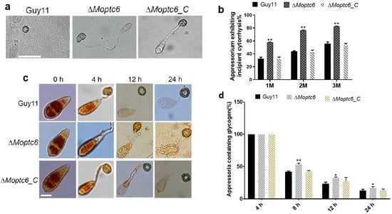 Figure 5.Moptc6 promotes appressorium turgor pressure and mobilization of glycogen. (a,b) Indicates incipient cytorryhsis conducted to examine appressorium turgor pressure for ∆Moptc6, WT, and complementation strains. Appressoria were incubated for 24 h period and tested with various concentrations of glycerol, 1, 2, and 3 M, 5 min before viewed by using microscope. Scale bar = 20 μm. (c,d) Micrograph displayed glycogen utilization from conidium to appressorium and percentages of glycogen levels in conidium and in appressorium at different time points, 4 h, 8 h, 12 h, and 24 h, in mutant compared to WT. Asterisks displays statistically significant (*, p < 0.05; **, p < 0.01). Scale bar = 10 μm.