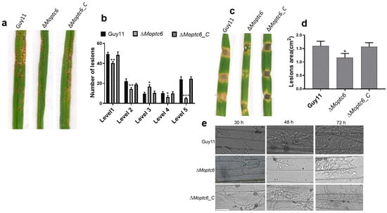 Figure 6. Virulence analysis of MoPtc6 in M. oryzae. (a,b) The figures displayed the pathogenicity analysis and lesions quantification assay for ∆Moptc6, WT, and complementation strain. Images were captured one-week post-spraying. (c,d) Indicate the lesion areas on barley leaves induced by ΔMoptc6, ΔMoptc6-com, and the WT strains’ mycelia plugs; lesion areas were calculated by using Image J software. (e) Observation of invasive hyphae in ten-day-old barley leaves infected with 5 × 104 spores/mL and photographed after 24 h, 48 h, and 72 h post-inoculation. Asterisks displays statistically significant (*, p < 0.05; **, p < 0.01; ***, p < 0.001). Scale bar = 20 μm.