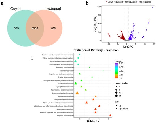 Figure 7. Expression of genes between ∆Moptc6 and WT. (a) Global view of gene expression levels in ∆Moptc6 and WT. This figure was generated by Jvenn software version 2.1.0. (b) Volcano figure plotted by using R software 4.3.3, indicating differentially expressed gene (DEG) distribution patterns in ∆Moptc6 mutant and WT. Red dots demonstrate downregulated genes, and blue dots represent up-regulated genes. (c) Displaying the KEGG pathways enriched by differentially expressed genes (DEGs) (p < 0.01).