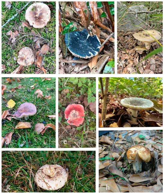 Russula species (a) Russula adusta (b) R. albonigra (c) R. alutacea (d) R. cyanoxantha (e) R. griseocarnosa (f) R. virescens (g) R. delica (h) R. foetens (https://www.inaturalist.org/; accessed on 10 March 2025, the images are used under the license Attribution Non-Commercial-No Derivs 4.0).
