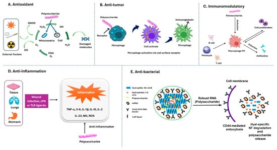 Bioactive properties and mechanism of polysaccharides from Russula []. (A) Antioxidant: polysaccharides scavenge ROS, protecting cells from oxidative damage. (B) Anti-tumor: they activate macrophages, enhancing the immune response. (C) Immunomodulatory: they stimulate immune cells, boosting antibody production and cell proliferation. (D) Anti-inflammatory: they reduce cytokines (TNF-α, IL-6, and IL-1β) and oxidative stress. (E) Anti-bacterial: they facilitate bacterial RNA targeting and membrane degradation via CD44-mediated endocytosis.
