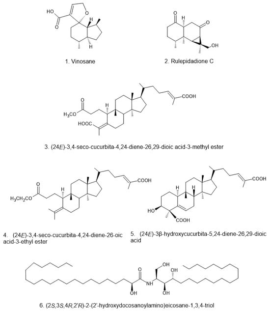 Four aristolane sesquiterpenes were isolated from the fruiting bodies of R. lepida (=Russula rosea, www.indexfungorum.org, accessed on 26 March 2025) []. Three new triterpenoids and two new aristolane sesquiterpenoids were isolated from R. lepida. Notably, two of the compounds are the first naturally occurring seco-ring-A cucurbitane triterpenoids, while two others represent a rare type of aristolane sesquiterpenoids found among fungi [,]. From the extract of R. lepida fruiting bodies, which exhibit anti-tumor activity, four new cucurbitane-type triterpenoids were isolated: (24E)-3β-hydroxycucurbita-5,24-dien-26-oic acid, (24E)-3,4-seco-cucurbita-4,24-diene-3,26-dioic acid, (24E)-3,4-seco-cucurbita-4,24-diene-3,26,29-trioic acid, and lepidolide [,]. Fatty acid esters of velutinal, three new sesquiterpenoids, and Russulanobilines A–C, along with eight known compounds, were isolated from extracts of R. nobilis fruiting bodies []. These sesquiterpenes have unique structures for chemical defense machinery, which protects mushrooms against predators, parasites, and microorganisms []. Piperalol and piperdial, bioactive compounds isolated from R. queletii have shown potential in various biological activities, including antimicrobial and anticancer properties [].