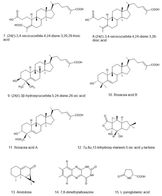 Russula is enriched with several species like R. alboareolata, R. alutacea, R. helios, R. medullata, R. monspeliensis, and R. virescens, all of which are widely consumed as foods [,,]. In addition to their edibility, species of Russula are also used as traditional medicines for the treatment of various diseases like fever (R. cyanoxantha and R. nobilis), wound healing (R. luteotacta), treating gastritis and high blood pressure (e.g., R. delica and R. parazurea), and even in skin cancer (R. acrifolia) []. Moreover, some Russula species have also been traditionally used as tonics such as R. acrifolia, R. cyanoxantha, R. delica, R. luteotacta, R. nobilis, and R. parazurea []. In addition, R. luteotacta is also used as a sleep-promoting agent []. Apart from all this usefulness, there are reports about side effects and toxicities of some Russula species as well []. Russula densifolia, R. fragtissima, and R. rosacea can cause gastroenteritis, while R. olivacea can cause nausea, vomiting, and diarrhea []. Russula subnigricans can cause rhabdomyolysis, severe electrolyte disturbance (hypocalcemia), respiratory failure, acute renal failure, pulmonary edema, ventricular tachycardia, and circulatory shock []. Few species of Russula are poisonous, like R. emetica and R. nigricans []. Moreover, the consumption of R. risigallina, R. olivacea, and R. velenovskyi may poseharmful effects due to exceedingly elevated levels of Cr and Cd, as compared to reference safety limits []. In spite of the large number of taxa, the secondary metabolites of Russula have not been well researched. However, in the following part of this paper, we discuss various bioactive compounds (Figure 2 and Figure 3) produced by Russula species and their beneficial medicinal properties.