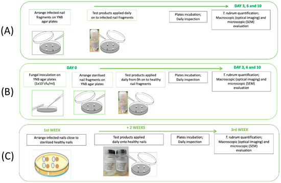 Infected nail fragments were transferred to new YNB agar plates and 2 μL of WSNS-PO, AMOR, and CIC was applied to the surface of infected nails once per day for 10 days. Treated nails were then incubated at 25 °C. Viable fungal cell recovery from nails was performed on days 3, 7, and 10 by tape-stripping. Following recovery, tapes were placed in Phosphate Buffer Solution (PBS) + 0.1% Triton X-100 and the resulting suspension was applied to glucose chloramphenicol agar plates following serial dilutions. Plates were incubated at 25 °C for 48–72 h and colony forming units (CFUs) were subsequently counted. Six replicates per experimental group were performed (five replicates for fungal quantification, and one replicate for determination of the presence of fungus by macroscopic and microscopic evaluation). A non-treated nail was used as a control. A schematic representation of the protocol is given in Figure 1A.