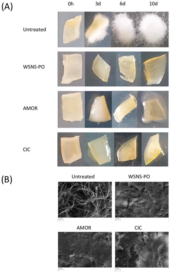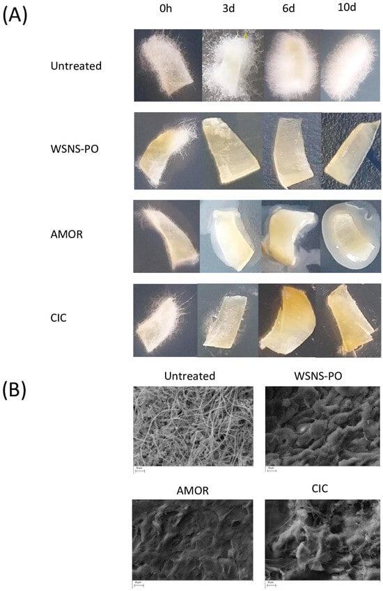 Macro- and microscopic aspect of nail fragments from infection prevention study. (A) Macroscopic images of nail fragments following incubation for (from left to right) 0 h, 3 days, 6 days, and 10 days: untreated control nail (top), WSNS-PO-treated nail (second row), AMOR-treated nail (third row), and CIC-treated nail (bottom). (B) Magnified views (×2.00 K) obtained with SEM following 10 days of treatment: untreated control nail (top left), WSNS-PO-treated nail (top right), AMOR-treated nail (bottom left), and CIC-treated nail (bottom right). Scale bar represents 10 µm.