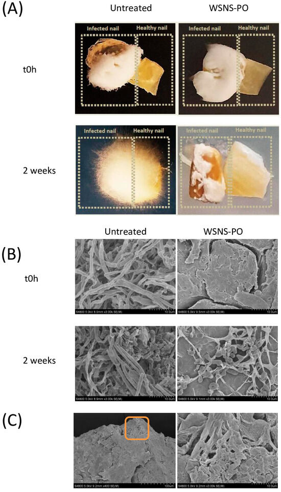 Macro- and microscopic aspect of nail fragments from transfection prevention study. (A) Macroscopic images of control (left) and WSNS-PO-treated nail fragments (right) at time 0 h (top) and after 2 weeks of treatment (bottom). (B) Magnified views (×3.00 K) obtained with SEM of control (left) and WSNS-PO-treated nail fragments (right) at time 0 h (top) and after 2 weeks of treatment (bottom). Scale bar represents 10 µm. (C) Microscopic aspect of fungal hyphae trying to invade an ex vivo nail fragments treated with WSNS-PO. Magnified view (×400) obtained with SEM (left). The right pane shows a magnified view (×3.00 K) of the orange box.