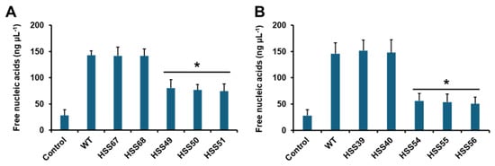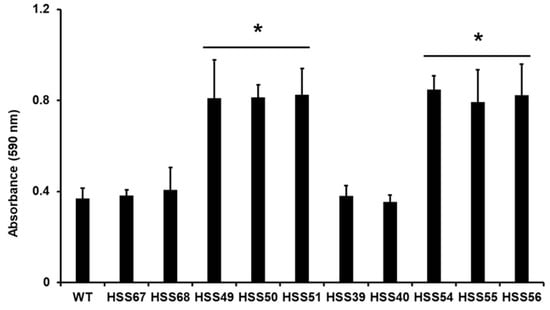 | HSS54 | 3.0 ± 0.9 | 18.4 ± 7.7 * | 3.4 ± 0.5 * | 1.5 ± 0.8 * | 0.9 ± 0.3 * |