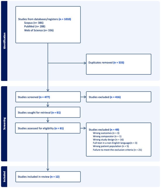 Our search identified a total of 1010 articles. After removing 533 duplicates, 416 articles were also excluded based on title and abstract analysis. The remaining 61 full-text articles were assessed for eligibility, resulting in the exclusion of 49 studies for the following reasons: 3 reported outcomes not relevant to our research question, 1 included an inappropriate control population (comparator), 16 did not follow an eligible study design (review), 3 were available only in a non-English language, 5 involved an incorrect patient population (misdefined RVVC), and 21 did not fully meet the exclusion criteria (Figure 1).