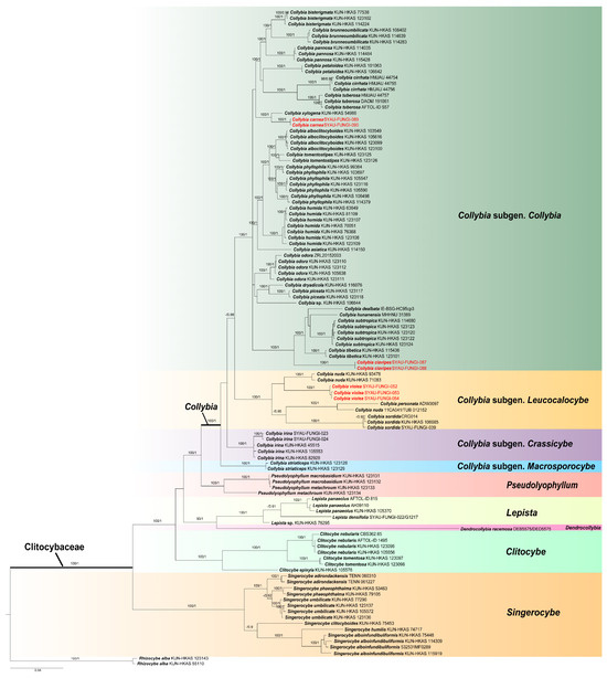 Phylogram of Clitocybaceae generated based on the combined ITS-nrLSU-rpb2-tef1-α dataset, with Rhizocybe alba as an outgroup. Bootstrap values (BP) ≥ 90% and Bayesian posterior probabilities (PP) ≥ 0.90 are shown around the branches. Newly generated sequences are shown in red.