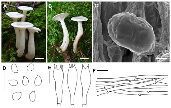 Notes: Within Collybia subgen. Collybia, several species also have small and white basidiomes, such as C. asiatica, C. bisterigmata and C. pannosa [14]. However, the clavate stipe and ellipsoid to sublacrymoid basidiospores of C. clavipes make it easily distinguished from these species, which generally have a cylindrical stipe and non-sublacrymoid basidiospores. Furthermore, C. asiatica differs from C. clavipes by its infundibuliform basidiome and having basidiospores always adhering in tetrads [14]; C. bisterigmata differs by having two-spored basidia and larger basidiospores (6.0–7.5 (8.0) × 4.0–6.0 μm) [14]; C. pannosa differs by having felty pileus, basidiospores sometimes adhering in tetrads and irregularly arranged pileipellis [14].