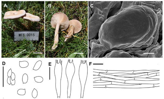 Morphological features of Collybia carnea (SYAU-FUNGI-089, holotype). (A,B) Habitat and ba basidiomes; (C) SEM images of basidiospores. Line drawings of (D) basidiospores; (E) basidia; (F) pileipellis. Scale bar: (A,B) 1 cm; (C) 1 μm; (D–F) 10 μm.