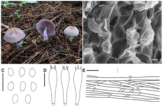 Morphological features of Collybia violea (SYAU-FUNGI-052, holotype). (A) Habitat and basidiomes; (B) SEM images of basidiospores. Line drawings of (C) basidiospores; (D) basidia; (E) pileipellis. Scale bar: (A) 1 cm; (B) 2 μm; (C–E) 10 μm.