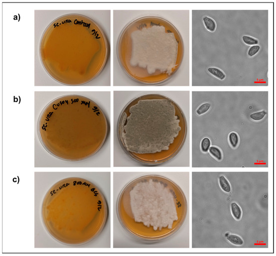 Analysis of P. destructans cultures subjected to different Cu-stress growth conditions. P. destructans was cultured on (a) SC-Ura (control), (b) SC-Ura + 500 µM CuSO4 (Cu-overload), and (c) SC-Ura + 800 µM BCS (Cu-withholding). Right column: Brightfield microscopic images of P. destructans spores grown under each condition are displayed at 1000× total magnification.