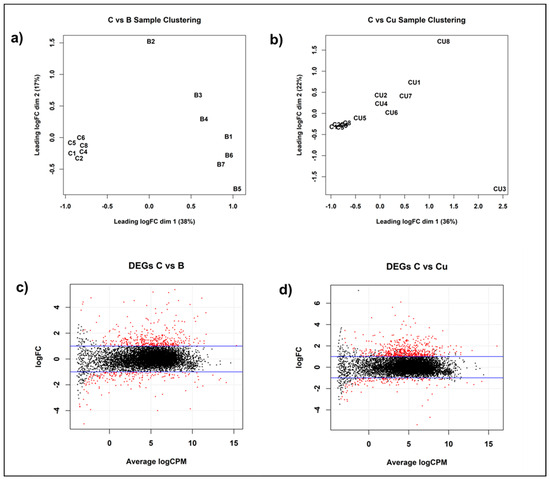 Differential gene expression response of Pseudogymnoascus destructans grown under Cu-stress conditions. (a) Multi-dimensional scaling (MDS) plot comparing Cu-withholding (“B”, i.e., SC-Ura + 800 µM BCS) treated versus control (“C”, i.e., SC-Ura) samples displaying the relative similarities in gene expression. (b) MDS plot comparing Cu-overload (“CU”, i.e., SC-Ura + 500 µM CuSO4)-treated versus control (i.e., SC-Ura) samples. (c) Genes differentially expressed under Cu-withholding versus control samples. Significantly upregulated and downregulated genes are indicated as red dots. (d) Genes differentially expressed under Cu-overload versus control samples. Significantly upregulated and downregulated genes are indicated as red dots.