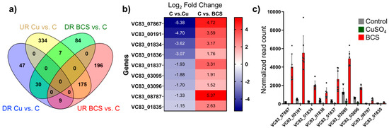 Differential expression of genes in Pseudogymnoascus destructans under copper stress conditions. (a) Venn diagram showing the differential expression of genes that are significantly upregulated (UR) and downregulated (DR) in P. destructans under conditions of Cu-withholding (“BCS”) and Cu-overload (“Cu”) stress. The Venn diagram illustrates the number of genes that are uniquely upregulated or downregulated in each condition, as well as those that are commonly regulated in both stress conditions (p < 0.05; Log2FC > 1; log10CPM > 1). (b) List of the (9) DEG shared between DR Cu vs. C and UR BCS vs. C with their corresponding fold changes. (c) Normalized read counts of the (9) DEGs shared between DR Cu vs. C and UR BCS vs. C. Plots represent the average read counts and standard error for control (gray bars with triangle symbols; n = 6), CuSO4 treatment (green bars with circle symbols; n = 8), and BCS treatment (red bars with square symbols; n = 7).