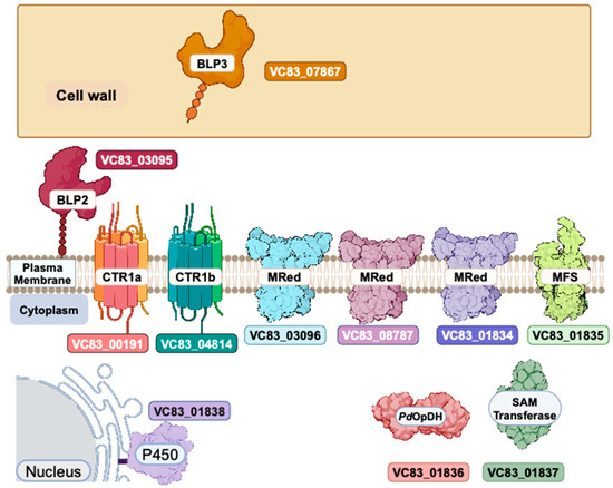Pathogenic microbes can secrete metal-binding small molecules to capture essential metal micronutrients. The most well studied are the Fe-binding siderophores [60], although Cu-binding calkophores [61] and Zn-binding zincophores [62,63,64,65] have been reported. We identify a cluster of five genes VC83_01834–VC83_01838, which show differential gene regulation displaying reciprocal transcriptional regulation in response to copper stress growth conditions (Figure 3 and Figure S2a). We identify VC83_01834 –VC83_01838 as the Copper-Responsive gene Cluster (CRC) (Figure 5). The four genes VC83_01834, VC83_01835, VC83_01836, and VC83_01837 segregate in a cluster of DEGs, which are significantly upregulated under Cu-withholding stress and repressed under Cu-overload conditions (Figure 3a,b). We have included the gene VC83_01838, which encodes for a cytochrome P450 monooxygenase enzyme, in the CRC gene cluster because it remains a significant DEG under both Cu-withholding and Cu-overload stress.