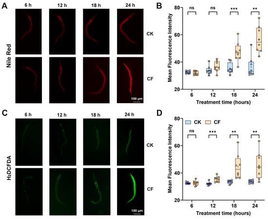 CQMa421-filtrate-induced intestinal damage and ROS accumulation in C. elegans. (A) Nile-red-stained intestinal lipid droplets. (B) Quantification of Nile red fluorescence. (C) H2DCFDA-stained ROS levels. (D) Quantification of ROS fluorescence. CK: 1/4 SDY control, CF: CQMa421 filtrate. Boxplots show the range from minimum to maximum. The central line indicates the median, and the ‘+’ symbol represents the mean. Statistical test used can be found in Table S2. ** p < 0.01, *** p < 0.001, ns indicates non-significant.