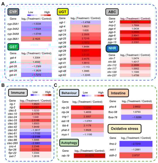 Gene expression profiles of C. elegans in response to CQMa421 filtrate treatment. (A) Expression patterns of detoxification genes. (B) Expression profile of immune-related genes. (C) Expression levels of genes associated with locomotor behavior, intestinal function, oxidative stress and autophagy.