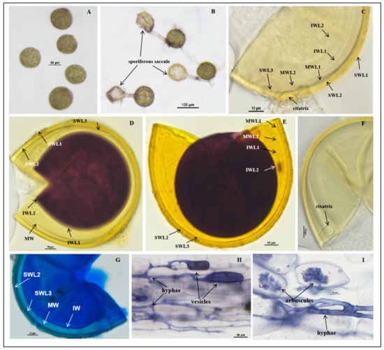 Acaulospora citrusnsis spores. (A) Intact spores in water; (B) intact spores with sporiferous saccule in root organ culture; (C–E,G) spore wall layers: SWL1 hyaline, forming the spore surface, usually absent in mature spores; SWL2 and SW L3 pale yellow to pale yellowish brown, permanent, laminate, and similar color; in some spores, the boundaries between layers are difficult to distinguish. The inner wall hyaline consists of two layers. IWL2 shows a pale pink reaction to Melzer’s reagent; (F) cicatrix; (H,I) mycorrhizal structures of A. citrusnsis in roots of C. junos stained in Quink ink–vinegar solution: hyphae, vesicles, and arbuscules; (D) in Melzer’s reagent; (E) in PVLG + Melzer’s reagent; (B,F) in PVLG reagent; (G) in laetophenol cotton blue.