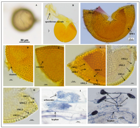 Acaulospora guangxiensis spores. (A) Intact spores in water; (B) crushed spore and sporiferous saccule; (C–H) spore wall layers, L1 smooth, hyaline and evanescent and completely shed; SWL2 and SWL3 laminate and similar color; in some spores, the boundaries between layers are difficult to distinguish; middle wall (MWLl–MWL2) hyaline, semiflexible bilayered tightly adherent; inner wall (IWL1–IWL3) hyaline, consists of three layers. Note: MW and IW are easily separated in PVLG, and IWL3 shows a pale pink reaction to Melzer’s reagent. (G,H) Cicatrix circular to subcircular, slightly raised collar; (I,J) mycorrhizal structures of A. guangxiensis in roots of C. junos stained in Quink ink–vinegar solution: hyphae (J), vesicles (J), and arbuscules (I); (B–F) in Melzer’s reagent; (G) in PVLG + Melzer’s reagent; (H) in PVLG reagent.