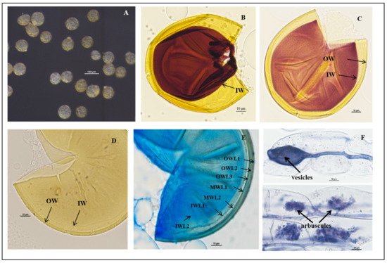 Acaulospora jiangxiensis spores. (A) Intact spores in water; (B–E) spore wall layers: SWL1 hyaline, forming the spore surface, usually absent in mature spores; SWL2 and L3 pale yellow to pale yellowish brown, permanent, laminate and similar color; in some spores, the boundaries between layers are difficult to distinguish; germinated wall hyaline consists of two layers. IWL2 shows a reaction to Melzer’s reagent; (F) mycorrhizal structures of A. jiangxiensis in roots of C. junos stained in Quink ink–vinegar solution: hyphae, vesicles, and arbuscules; (B) in Melzer’s reagent; (C) in PVLG + Melzer’s reagent; (D) in PVLG reagent; (E) in laetophenol cotton blue.