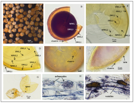 Description: Sporocarps unknown. Spores form singly in soil, borne laterally from the neck of a sporiferous saccule (Figure 2B). At the proximal end of mycelia, there is a sporiferous saccule which is similar in size to the spores. The sporiferous saccule shrinks and becomes empty after the spores mature completely and, usually, shed after wet screening: spores sessile, globose to subglobose, (70.0–)85.0(−100.0) μm in diameter; occasionally elliptic, (72.0–85.0) × (100.0–110.0) µm, hyaline when young, later pale yellow. Spore wall (SW) consists of three layers (L1–L3), SWL1 forming the spore surface, evanescent, hyaline, (0.5–)1.0(–1.2) μm thick, usually with debris attached to it. When not degraded, it is 0.7–1.0 µm thick. With the aging of the spores, it degrades, leaving only residual attachment L2, usually absent in mature spores (Figure 2C–E), dyed dark blue in the lactophenol cotton blue reagent (Figure 2G); SWL2 permanent, pale yellow, pale brownish yellow, laminate, consisting of multiple sublayers of varying thickness, 3.1–4.9 µm thick, no obvious discoloration in Melzer’s reagent and PVLG reagent, lactic acid phenol cotton blue reagent with longer staining time, finally dyed dark blue (Figure 2C–E,G). SWL3 concolorous with SWL2, translucent, tightly adherent to L2, and can be separated from L2 after forced crushing of spores, 1.0–1.5 µm thick. None of these wall layers stains in Melzer’s reagent (Figure 2C–E,G).