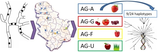 - Vojvodić, M.; Tanović, B.; Mihajlović, M.; Mitrović, P.; Vico, I.; Bulajić, A. Molecular identification and characterization of binucleate Rhizoctonia spp. associated with black root rot of strawberry in Serbia. Pestic. Phytomed. 2018, 33, 97–107. [Google Scholar] [CrossRef]