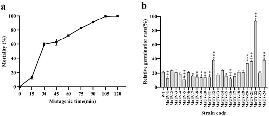 Twenty-four UV-induced mutants of the monospore culture of Ma-83 were isolated after UV-irradiation for 90 min and named as MaUV-1 to MaUV-24, respectively. Five of them (MaUV-12, MaUV-20, MaUV-21, MaUV-22, and MaUV-24) exhibited significantly higher UV resistance than the WT strain (Figure 1b). The MaUV-22 mutant presented the highest germination rate of 92.9% under UV irradiation for 1 h. The five selected mutants were subjected to further biological tests.