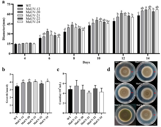 Growth rate and conidial production of the mutants and wild-type strain (WT). (a) Diameters of fungal colony of the mutants and the WT strain on PDA. (b) The average daily growth of the mutants and the WT strain on PDA in terms of fungal colony diameter. (c) Conidial production of the mutants and the WT strain on PDA. (d) Top-view images of the wild-type (WT, Ma83) and five UV-induced mutants grown on PDA medium for 14 days. The scale bar in (d) represents 1 cm, and the red arrow marks the colony’s maximum growth margin. Data represent the mean ± SE (n = 3). One-way ANOVA was performed using Duncan’s multiple range test. Different lowercase letters indicate a significant difference at p < 0.05.