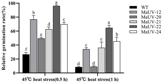 After suffering heat stress at 45 °C for 0.5 h, the conidial germination rates of the five mutants were significantly higher than that of the WT (26.7%), and the germination rate of MaUV-22 was the highest (96.1%, Figure 3). When the heat stress time reached 1 h, the germination rates of all strains decreased, while the mutants except for MaUV-20 still showed a higher heat resistance to the WT strain. The mutant MaUV-22 exhibited the highest germination rate of 64.8%, while the germination rate of the WT strain was decreased to 8.6% (Figure 3). Thus, the mutants exhibited a higher heat resistance than the WT strain, and MaUV-22 with the highest heat resistance was selected for further tests.