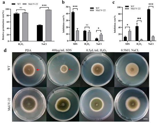 Response of the mutant MaUV-22 and WT strain to different environmental stresses on different developmental stages of conidial germination, mycelial growth, and sporulation. (a) Effects of three stress agents on conidial germination of the mutant MaUV-22 and the WT strain. (b) Relative inhibition rates of the three stress agents on the fungal colony growth of the mutant MaUV-22 and the WT strain. (c) Relative inhibition rates on the conidial production of the mutant MaUV-22 and the WT strain. (d) Top-view images of the strain (WT and MaUV-22) grown on PDA supplemented with SDS, H2O2, and NaCl for 10 days. The scale bar in (d) represents 1 cm, and the red arrow marks the colony’s maximum growth margin. Data represent the mean ± SE (n = 3). Significant differences were determined by the independent-samples t-tests for pairwise comparisons; ‘ns’ p > 0.05; ‘*’ p < 0.05; ‘**’ p < 0.01; ‘***’ p < 0.001.