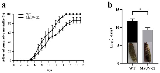 The bioassay revealed that the mutant MaUV-22 exhibited a higher virulence against G. mellonella larvae than the WT strain. The mutant MaUV-22 led to a 100% mortality of the larvae, while the WT strain only led to a mortality of 76.67% on the 15th day of bioassay (Figure 5a). Compared with the WT strain, the mutant MaUV-22 showed a significantly faster knocking down speed to G. mellonella larvae with an LT50 of 9.18 d, 3.02 d less than that of the WT strain (Figure 5b), indicating the enhanced virulence of the mutant MaUV-22.