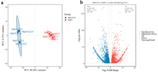 MaUV-22 versus WT (Ma83) RNA sequencing analysis. (a) Principal component analysis (PCA). Each point represents a sample, and similar samples are close to each other. The confidence is the solid line range of the ellipse. (b) DEGs volcanic plots of MaUV-22 versus WT (Ma83). Each dot represents a gene, where the blue dot represents downregulated genes while the red dot represents upregulated genes.