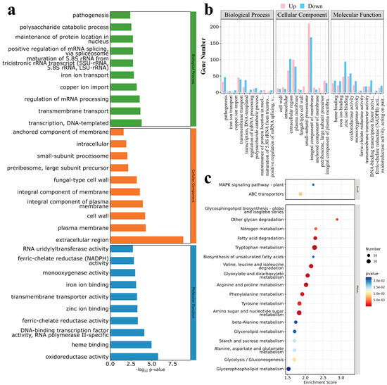 GO and KEGG analyses of the DEGs indicated that the DEGs between the mutant MaUV-22 and the WT strain were assigned to 94 functional groups belonging to three GO terms: biological processes (bp), cellular components (cc), and molecular functions (mf). The DEGs in the biological processes were mainly related to the function of DNA-templated transcription, transporting, mRNA regulation, and pathogenesis, etc. Concerning the DEGs in the cellular components, extracellular and intracellular regions, plasma membrane, cell wall, etc. were mainly affected. In the molecular functions, the DEGs were found in oxidoreductase activity, heme binding, DNA-binding transcription factor activity, RNA polymerase II-specific, and ion bonding, etc. (Figure 7a). Statistically, more upregulated genes appeared in the cell components, but more downregulated genes appeared in the biological processes and molecular functions (Figure 7b).