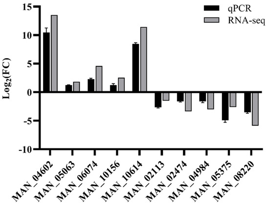 Validation of the gene expression in the transcriptome by qPCR. The qPCR and RNA-Seq data represent the log2 fold-change (FC) values of selected genes, calculated by the ΔΔCt method and DESeq2, respectively. The qPCR data are presented as the mean ± standard error (SE) of three biological replicates.