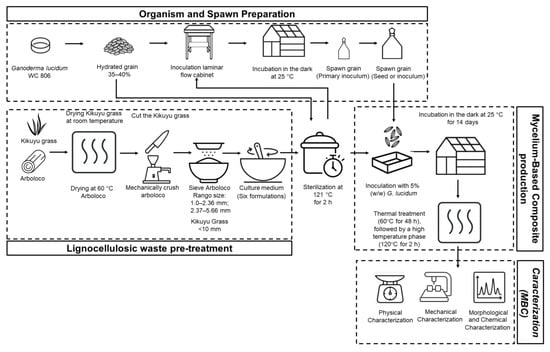 Figure 1. Schematic of the production and characterization process of a mycelium-based material (MBC) from lignocellulosic waste and Ganoderma lucidum. The diagram illustrates four main stages of the process: (1) Organism and spawn preparation involves cultivating Ganoderma lucidum WC 806 on sterilized grain until complete colonization. This process involves two phases: the preparation of a primary inoculum, followed by the production of fungal spawn intended for substrate inoculation. (2) Lignocellulosic waste pre-treatment occurs in parallel with the first stage. Both wastes are crushed, and after that, Arboloco is sieved into two particle ranges. Finally, the lignocellulosic waste is mixed based on the six formulations proposed in this work. (3) Mycelium-based composite production uses mixtures of Kikuyu grass (Pennisetum clandestinum) and Arboloco (Montanoa quadrangularis). This stage includes the preliminary conditioning of materials, substrate formulation, sterilization, and inoculation, followed by incubation until complete colonization of the material. (4) Material characterization involves thermal treatment for drying and inactivation, followed by physical, mechanical, and chemical analyses to evaluate the potential of the composite as an alternative biomaterial.