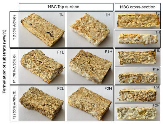 Figure 2. Photographs of the mycelium-based composite at the top surface and cross-section under six different formulations—TH, TL, F1L, F1H, F2L, and F2H—where A: Arboloco pith; G: Kikuyu grass; F1: 70% A/30% G; F2: 30% A/70% G; and Arboloco pith particle sizes are L: 1.0–2.36 mm and H: 2.37–5.66 mm.