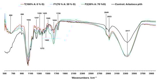 Fourier transform infrared spectroscopy (FTIR) analysis of the MBC colonized by G. lucidum (Figure 4) revealed distinct structural modifications compared to non-colonized raw material (uncrushed Arboloco pith) obtained in previous studies in our laboratory [35]. The peaks in the fingerprint and their functional group interactions are assigned based on previous studies FTIR studies on the changes in wood chemistry following decay by brown-rot and white-rot fungi [18,36]. A progressive decrease (T1 < F1 < F2) in intensity at 1042 cm−1 (C-O-C and C-O stretching vibrations in cellulose and hemicellulose) and 890 cm−1 (C–H deformation of cellulose) demonstrates fungal hydrolysis of polysaccharides in cellulose, while the decline of the 1735 cm−1 band (ester C=O stretching) indicates hemicellulose deacetylation [18,37]. A notable change was observed at 1247 cm−1, where the strong peak in non-colonized Arboloco material declines after fungal colonization, indicating the degradation of aryl-ether and ester linkages in lignin and hemicellulose, respectively. In concordance with the enzymatic white-rot fungi, the complete disappearance of peaks at 1425 cm−1 (CH2 bending in crystalline cellulose), 1596 cm−1, and 1505 cm−1 (aromatic C=C vibrations in lignin) in the MBC samples provided further evidence of the structural breakdown of lignin and complex carbohydrate bonds. On the other hand, the progressive broadening and elongation of the 1634 cm−1 peak (C=O stretching) shows the accumulation of oxidized lignin derivatives (carbonyl and quinoid structure) associated to components such as chitin and glucans, while the broadening and intensification of the 3317 cm−1 (O-H/N-H stretching) band with respect to the control (uncrushed Arboloco pith) suggests increased hydrophilicity resulting from both the exposure of cellulose hydroxyl groups after lignin removal and the water-binding capacity of fungal mycelium. The inverse relationship between peaks at 1042 cm−1 and 1634 cm−1 (Figure 4) suggests the accumulation of exopolysaccharides, as observed in Figure 3G–I under the F2 formulation. Previous studies support this behavior, in which a decline in the peak at 1042 cm−1 is attributed to the depolymerization of cellulose into monomeric sugars, which fungi metabolize to synthesize the EPS as β-glucans [18], while an increase in the peak at 1634 cm−1 is linked to oxidized lignin derivatives and the simultaneous production of carbonyls and glucuronic acid (a component of fungal β-glucans) [38,39]. These spectroscopic changes collectively illustrate the unique ability of white-rot fungi to degrade all major lignocellulose components through a combination of hydrolytic and oxidative mechanisms while simultaneously introducing fungal exopolysaccharides into the substrate matrix.