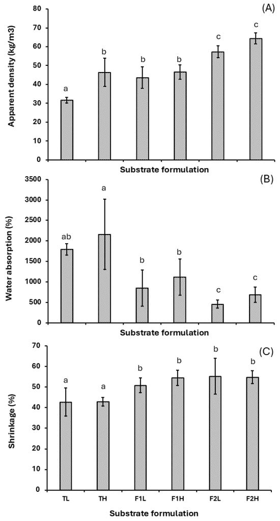 Figure 5. Physicochemical properties of MBC: (A) apparent density, (B) water absorption, and (C) shrinkage under different substrates. A (Arboloco pith), G (Kikuyu grass), and particle sizes L (1.0–2.36 mm) and H (2.37–5.66 mm). Substrate formulations T (100% A/0% G), F1 (70% A/30% G), and F2 (30% A/70% G). The results are shown as the mean ± SD. The lowercase letters above bars indicate significant differences between substrate formulations (Tukey, p ≤ 0.05, n ≥ 10).
