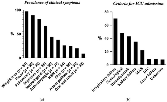 (a) Prevalence of clinical symptoms. (b) Criteria for ICU admission. HSM: Hepato-splenomegaly; MAS: macrophage activation syndrome; DIC: disseminated intravascular coagulation. N: number of patients for whom data were available.