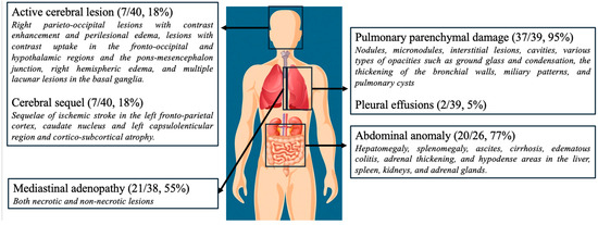 Imaging findings. CNS involvement included cerebral sequelae (7 patients) and active lesions (7 patients), corresponding to a total of 10 patients, with some exhibiting both types of lesions.