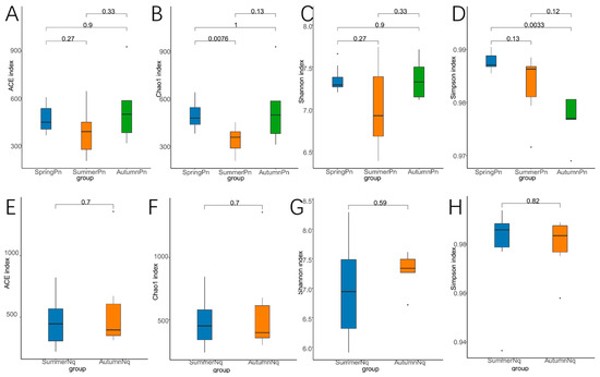 Box plot of variation in alpha diversity indices for skin fungal communities on Pelophylax nigromaculatus across three seasons (A–D) and on Nanorana quadranus across two seasons (E–H). The horizontal coordinates are the group names, and the vertical coordinates are the values of the corresponding alpha diversity indices. (A,E) Wilcoxon test of Chao1 index; (B,F) Wilcoxon test of ACE index; (C,G) Wilcoxon test of Shannon index; (D,H) Wilcoxon test of Simpson index.