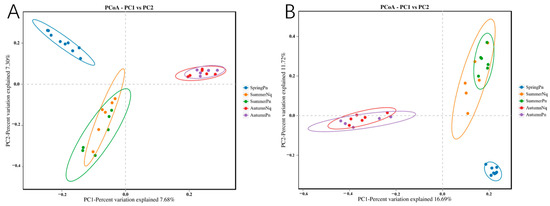 The SpringPn, SummerPn, and AutumnPn groups shared 58 ASVs, accounting for 1.12% of the total across both datasets (Supplementary Figure S2). The SummerNq and AutumnNq groups shared 177 ASVs (3.81%) (Supplementary Figure S3).