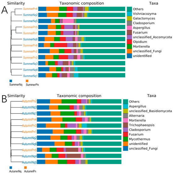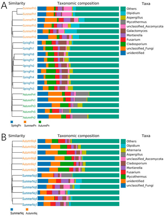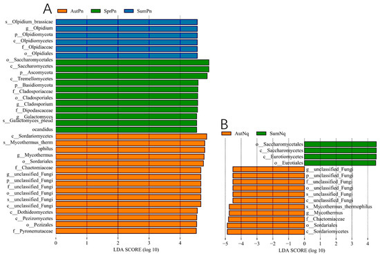 Next, LEfSe (LDA score of 4.5) analyses of the fungal populations with intergroup differences in relative abundance revealed the presence of multiple biomarkers (Figure 5). At the genus level, the most abundant biomarker in SpringPn was Olpidium, while those in SummerPn were Cladosporium and Galactomyces and those in AutumnPn were Mycothermus and unclassified_Fungi (Figure 5A). The most abundant biomarkers in SummerNq were unclassified_Fungi and Mycothermus (Figure 5B). The persistence of the unclassified_Fungi genus across seasons and hosts may represent an understudied symbiotic lineage with generalized stress tolerance.