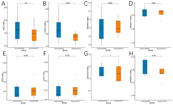 Box plot of variation in alpha diversity indices for skin fungal communities on P. nigromaculatus and N. quadranus in the same seasons, including summer (A–D) and autumn (E–H). The horizontal coordinates are the group names, and the vertical coordinates are the values of the corresponding alpha diversity indices. (A,E) Wilcoxon test of Chao1 index; (B,F) Wilcoxon test of ACE index; (C,G) Wilcoxon test of Shannon index; (D,H) Wilcoxon test of Simpson index.
