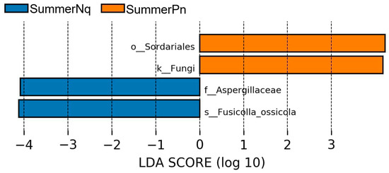 When the LDA score was set to 4.0, the SummerPn and SummerNq groups had one biomarker each, namely Fusicolla ossicola (species level) and Sordariales (order level) (Figure 8), respectively. None of the frog species exhibited biomarkers in autumn.
