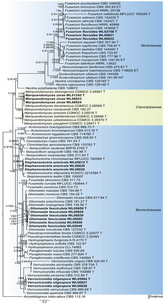 Analyses of the hypocrealean fungal phylogeny were conducted by using a combined LSU (875 bp), ITS (634 bp), tef1 (849 bp) and rpb2 (908 bp) dataset. For the BI analysis, the GTR+I+G model was selected for the LSU, ITS and rpb2 loci, while the GTR+G model was used for the tef1 locus. The phylogeny showed that our five new species were clustered into five genera in three families (Bionectriaceae Samuels & Rossman, Clavicipitaceae (Lindau) Earle, and Nectriaceae Tul. & C. Tul.), namely Fusarium flavoides, Gliomastix fasciculata, Marquandomyces ulvae, Stephanonectria arenicola, and Verruciconidia oligospora (Figure 1). In order to provide a more accurate illustration of the genetic relationships between the five new species and other species within the same genus, phylogenetic analyses were conducted for each genus based on multi-locus datasets (Supplementary Figure S1).