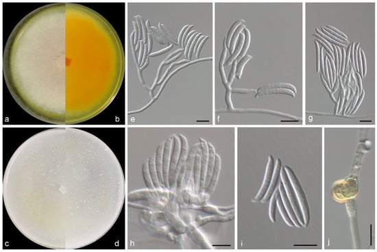 Morphological characters of Fusarium flavoides (from ex-type WL03768). (a–d) Colonies on PDA and OA after 7 d; (e–h) conidiophores and conidiogenous cells; (i) conidia; (j) chlamydospores. Bars: (e–j) = 10 μm.