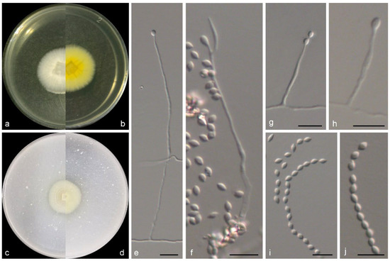 Morphological characters of Marquandomyces ulvae (from ex-type WL01242). (a–d) Colonies on PDA and OA after 7 d; (e–h) conidiophores and conidiogenous cells; (i,j) conidia in chains. Bars: (e–j) = 10 μm.