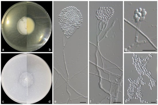 Considering that fungi often exhibit distinct colony morphological characteristics on different culture media, this study employed three different culture media to obtain a more comprehensive understanding of the cultural characteristics of the studied isolates. The isolates studied were incubated in the dark on PDA and oatmeal agar (OA) at 25 °C in the dark for seven days. Seven days later, culture characteristics including colony morphology, pigmentation, and odour were observed. Colours were assessed according to the colour charts of Kornerup and Wanscher [23]. Micromorphological characteristics were examined and photo-documented using water as a mounting medium under an Olympus BX53 microscope with differential interference contrast (DIC) optics [22]. For each species, 30 conidiophores, 30 conidiogenous cells, and 50 conidia were mounted and measured randomly, respectively [22].